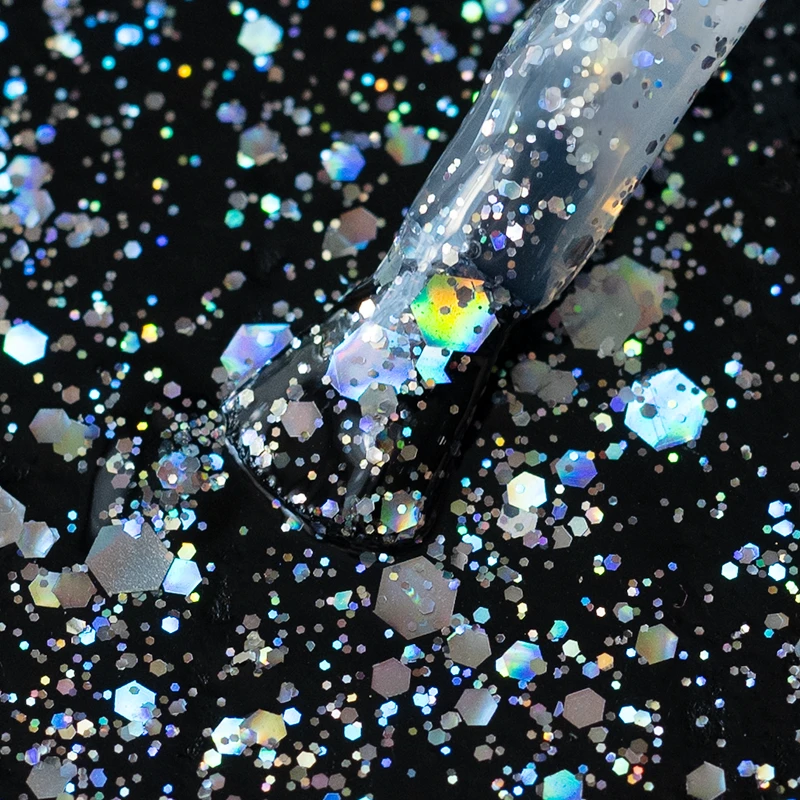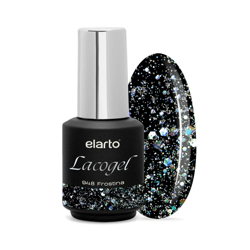 Lacogel 948 Frostina to srebrny odcień, który nie potrzebuje filtrów - jego efekt WOW widać już w pierwszej warstwie. To połączenie drobnych, wielowymiarowych holo-drobinek i większych, odbijających światło hexów, które tworzą efekt krystalicznego princess glow na paznokciach. Ten lakier został stworzony dla stylistek, które kochają czysty blask, zimowy luksus i efekt biżuteryjnej, lśniącej tafli.