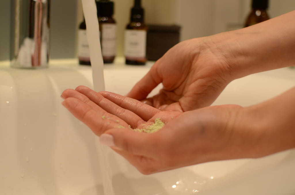 1. Na wilgotne dłonie nałóż dwie dozy pudru i pocieraj ręce do powstania kremowej konsystencji.