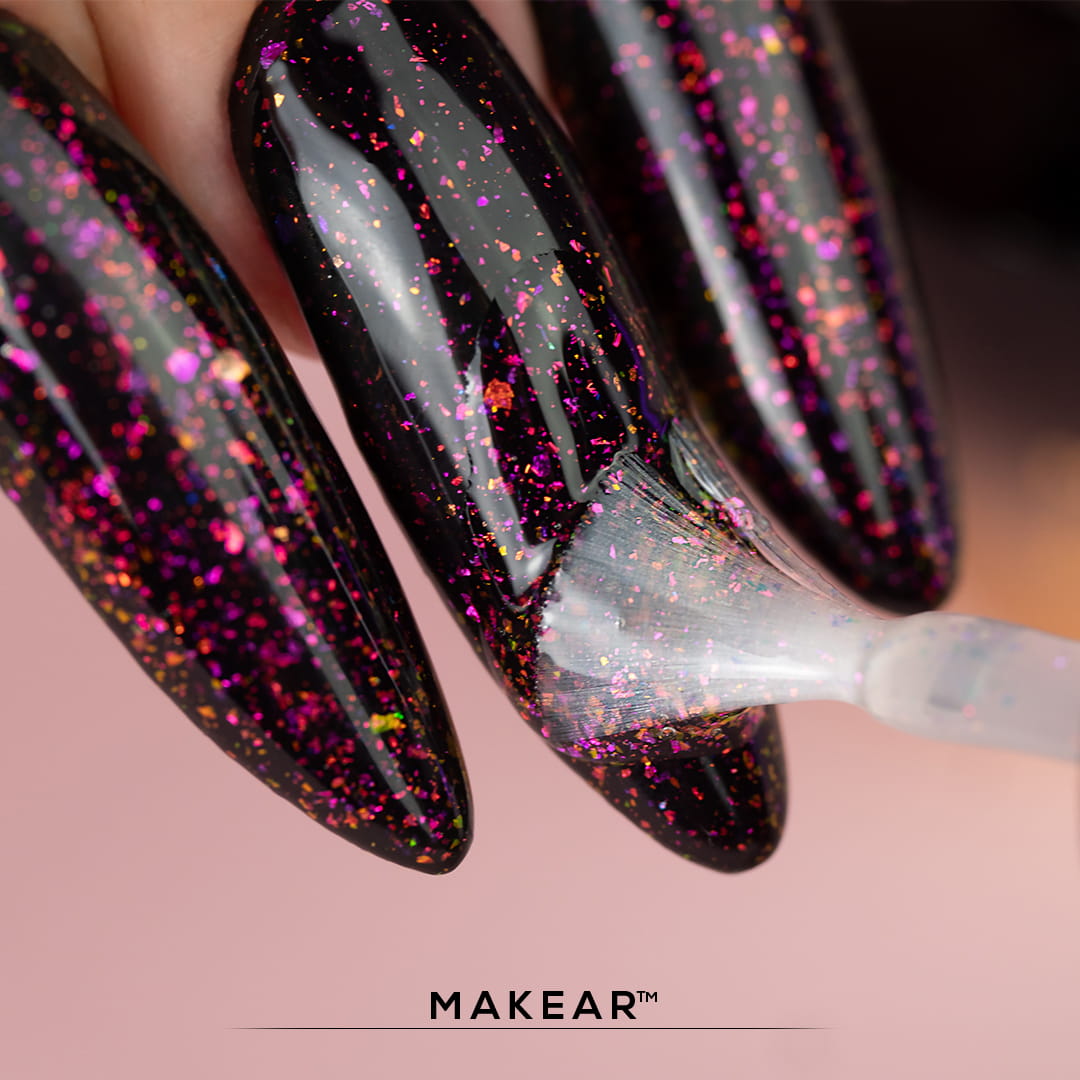 Top bez warstwy dyspersyjnej (TOP NO WIPE) zawierający drobiny pociętej foli transferowej z efektem kameleon dzięki której każda stylizacja otrzymuje niepowtarzalny wygląd.