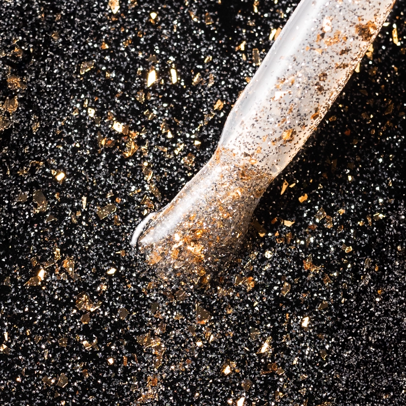 Elarto Dry Top Shine Bright Gold to profesjonalny top hybrydowy typu no wipe, zapewniający trwałe wykończenie z efektem flash. Nadaje manicure intensywny, świetlisty połysk, który przyciąga uwagę i podkreśla charakter stylizacji. Transparentna baza produktu z delikatnymi, srebrnymi drobinkami oraz płatkami w odcieniu szampańskiego złota nadaje manicure trójwymiarowy połysk, który zmienia się w zależności od kąta padania światła.