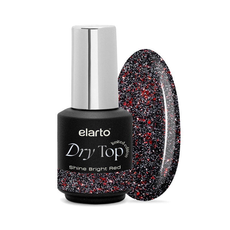 Elarto Dry Top Shine Bright Red to profesjonalny top hybrydowy typu no wipe, zapewniający trwałe wykończenie z efektem flash. Nadaje manicure intensywny, świetlisty połysk, który przyciąga uwagę i podkreśla charakter stylizacji. Transparentna baza produktu z delikatnymi, srebrnymi drobinkami oraz płatkami w czerwonym odcieniu nadaje manicure trójwymiarowy połysk, który zmienia się w zależności od kąta padania światła.